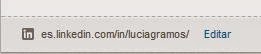 4- Personaliza tu URL. Estaría bien y es recomendable personalizar vuestra url de Linkedin para que sea amigable y así ponerla luego en el CV de papel o en Twitter. Simplemente hay que darle a “editar perfil” y justo debajo de vuestra foto aparece la URL que podéis editar.