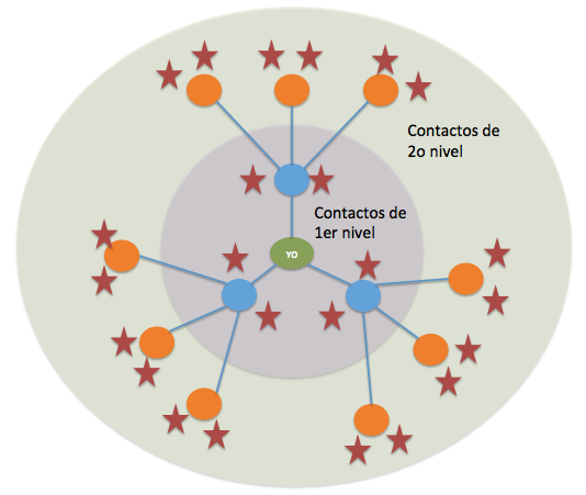 Si mis contactos de primer nivel construyen su propia red de la misma forma que yo y cada uno de ellos tiene acceso a 2 ofertas de trabajo, podré acceder a 18 ofertas de trabajo a través de mi red de contactos de segundo nivel más 6 ofertas a través de contactos de primer nivel. En total tendré acceso a 24 ofertas.
