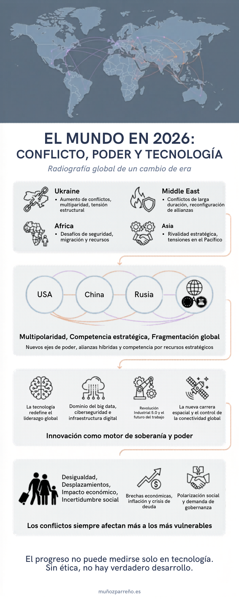 El análisis del contexto internacional en 2026 obliga a asumir una realidad compleja: la humanidad se encuentra simultáneamente en una fase de aceleración tecnológica sin precedentes y en un escenario de creciente inestabilidad geopolítica.