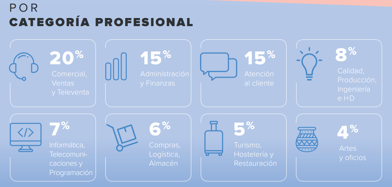 El sector Comercial y Ventas, sigue siendo el que tira más de este portal de empleo y le siguen Administración y Finanzas, Atención al Cliente, Calidad y Producción, Informática y Telecomunicaciones, Compras y Logística, Turismo y Hostelería; y por último Artes y Oficios.