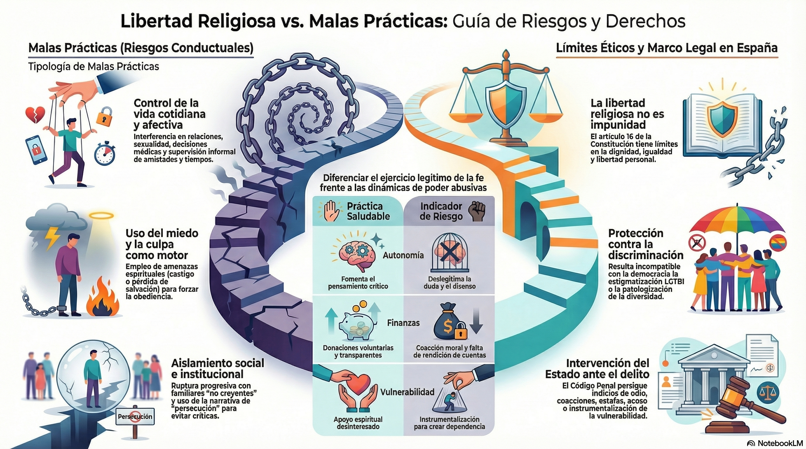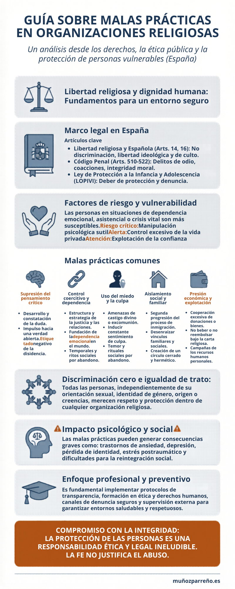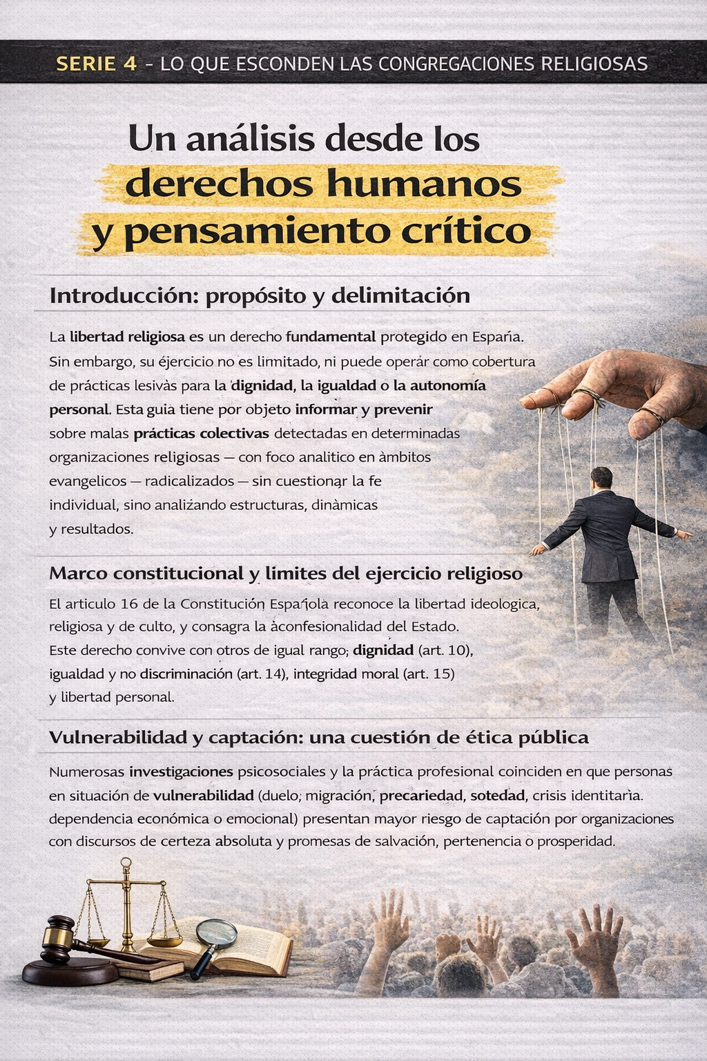 La libertad religiosa es un derecho fundamental protegido en España. Sin embargo, su ejercicio no es ilimitado ni puede operar como cobertura de prácticas lesivas para la dignidad, la igualdad o la autonomía personal. Esta guía tiene por objeto informar y prevenir sobre malas prácticas colectivas detectadas en determinadas organizaciones religiosas —con foco analítico en ámbitos evangélicos radicalizados— sin cuestionar la fe individual, sino analizando estructuras, dinámicas y resultados.