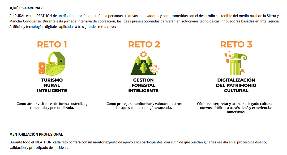 IDEATHON AI4RURAL es un maratón de innovación de 1 día que reúne a personas creativas, empresas tecnológicas, emprendedores y talentos locales para diseñar soluciones basadas en Inteligencia Artificial y tecnologías digitales, aplicadas al desarrollo sostenible del medio rural en la zona de Sierra y Mancha Conquense. itecam.com