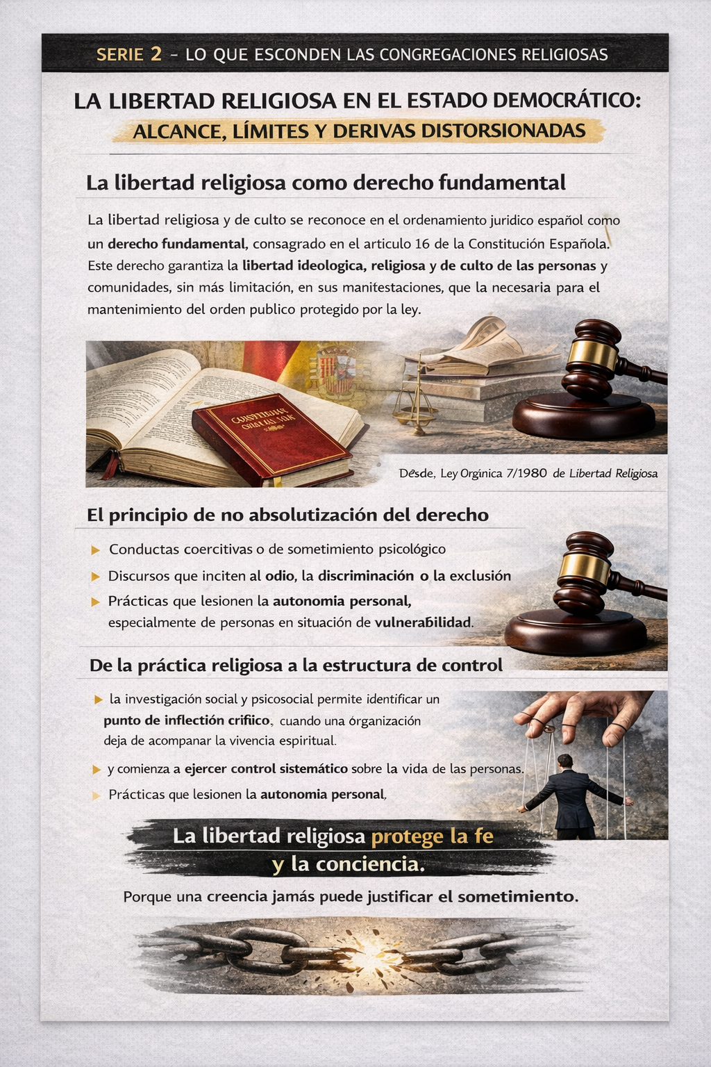 La libertad religiosa protege la fe y la conciencia, no el abuso ni la discriminación. Defender este derecho implica también defender sus límites, garantizando que ninguna creencia pueda convertirse en coartada para la humillación, el sometimiento o la exclusión social.