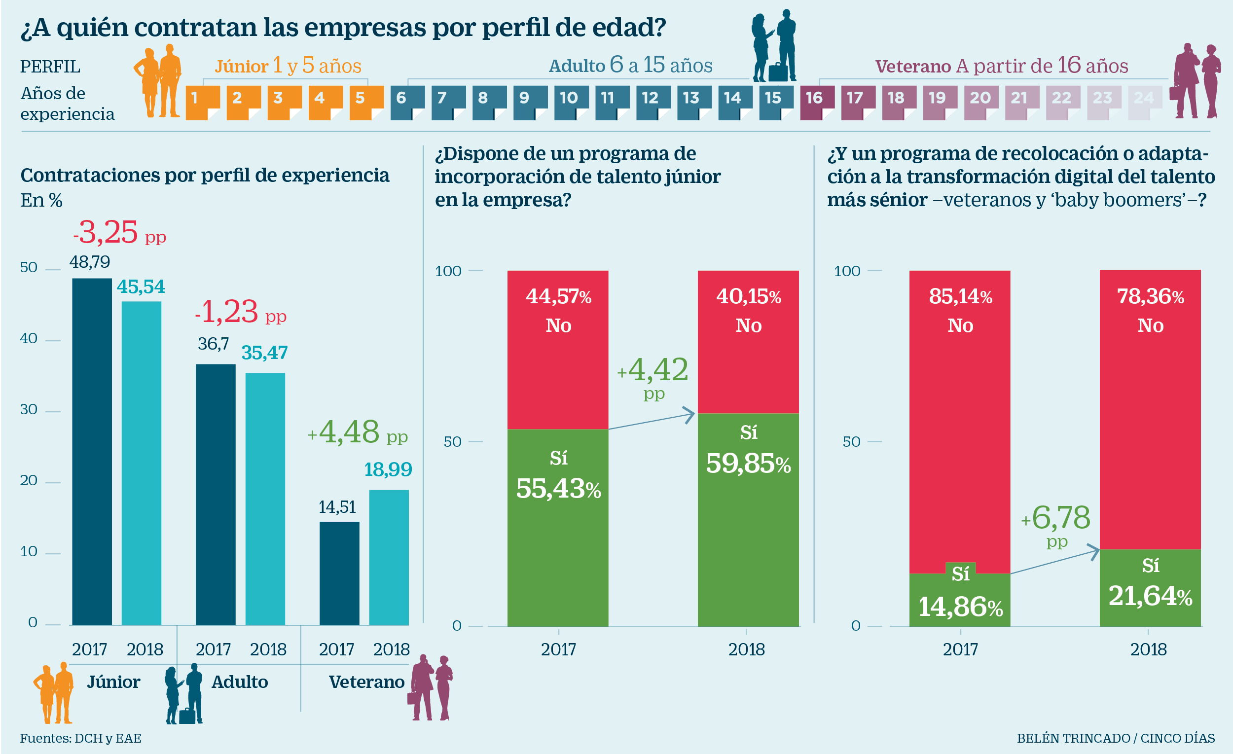 Casi la mitad del total de contrataciones que firmaron las empresas en 2018 recayeron en perfiles júnior, en un 45,5%, el grupo que de lejos atesora la mayoría de nuevas incorporaciones. Los profesionales adultos, por su parte, firmaron el 35% de los contratos, y los más veteranos el 19%. Así lo recoge el III Barómetro DCH sobre la gestión del talento en España, elaborado por la citada organización junto a EAE Business School. En el documento se observa cómo las compañías se centran con cada vez más esmero en acercarse a los perfiles más jóvenes, impulsando programas de incorporación especiales para estas franjas de edad. El problema es que estas medidas suelen ir acompañadas de un paulatino olvido hacia los profesionales más veteranos, que ven cómo el interés de las organizaciones por ellos mengua.