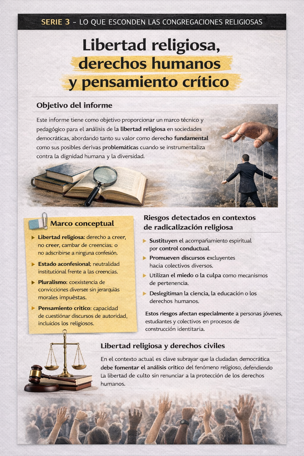 Este informe tiene como objetivo proporcionar un marco técnico y pedagógico para el análisis de la libertad religiosa en sociedades democráticas, abordando tanto su valor como derecho fundamental como sus posibles derivas problemáticas cuando se instrumentaliza contra la dignidad humana y la diversidad.