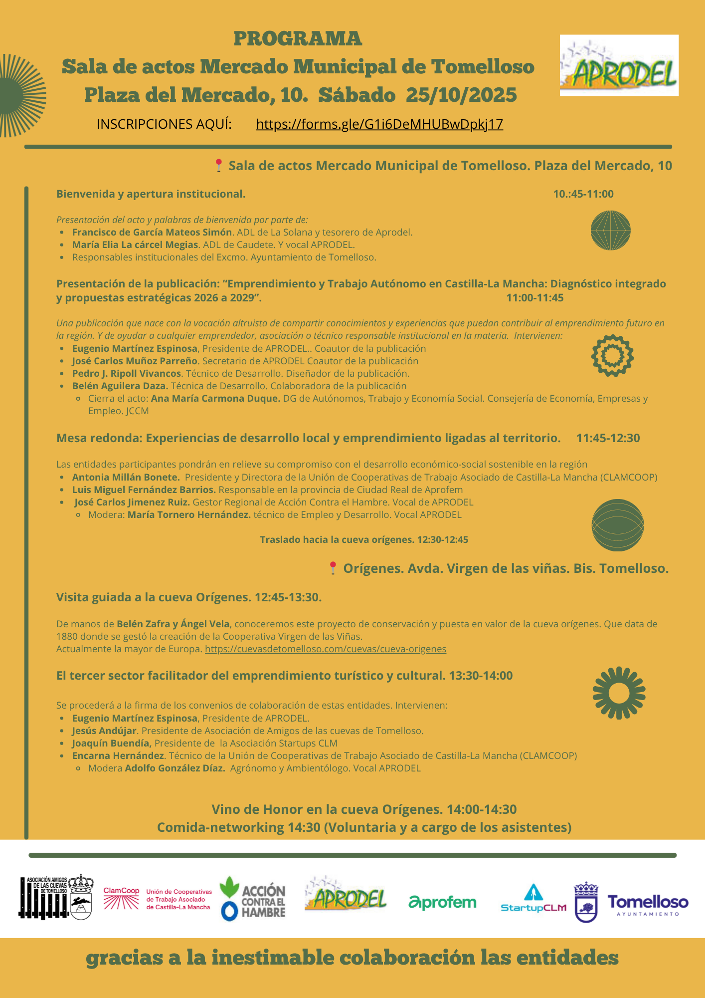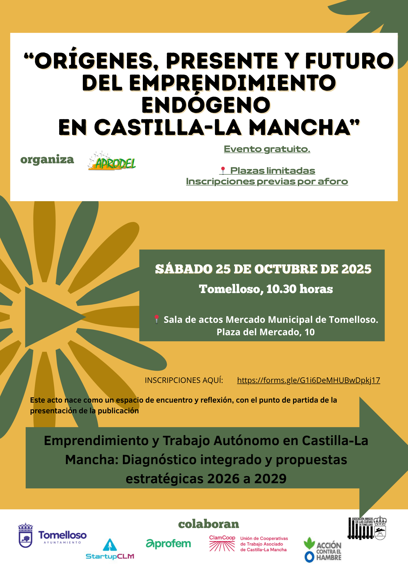 Este acto nace como un espacio de encuentro y reflexión, con el punto de partida de la presentación de la publicación: Emprendimiento y Trabajo Autónomo en Castilla-La Mancha: Diagnóstico integrado y propuestas estratégicas 2026 a 2029. Que dará pie a la generación de sinergias y puesta en valor del papel transformador del tercer sector y la economía social. Con ejemplos reseñables como la conservación del patrimonio por la asociación de amigos de las cuevas de Tomelloso. Las cooperativas de trabajo asociado en Castilla-La Mancha, de manos de Clamcoop. Y fortalecimiento del emprendimiento joven que ofrece aprofem. Un foro abierto emprendedores, tercer sector y administraciones públicas y ciudadanía interesada que compartirán experiencias, logros, retos y propuestas para construir una economía arraigada en los recursos endógenos del territorio, sostenible, respetuosa con el patrimonio y con justicia económica/ social.